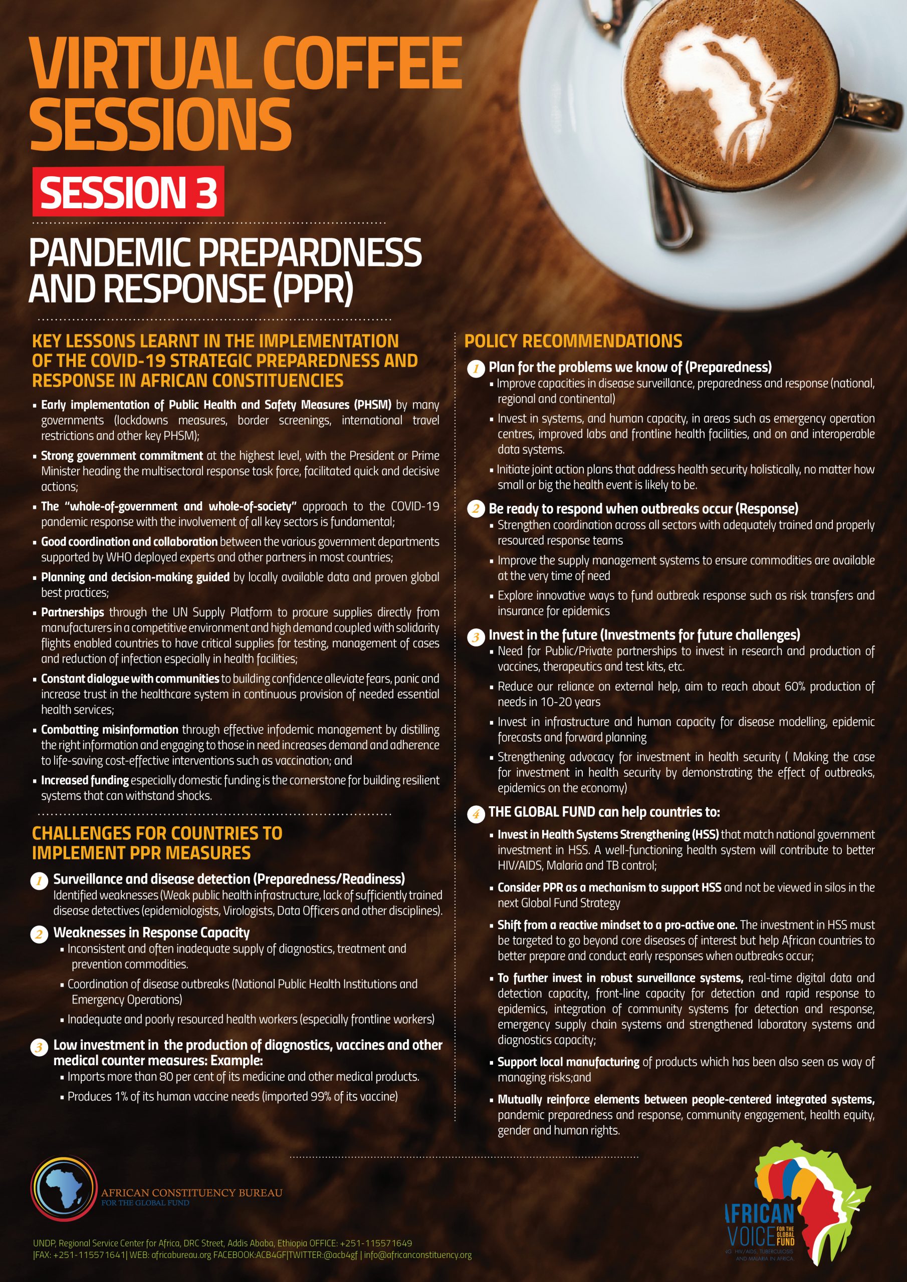 DetailsThis interactive session held on 27 July 2021, saw subject experts, including participants from African Risk Capacity (ARC), WHO/AFRO, Ministry of Health of Kenya and ACB board members sharing their insights on priority areas to strengthen PPR in the continent. Key lessons learnt in the implementation of the COVID-19 Strategic Preparedness and Response in African Constituencies[2] as well as policy recommendations for the Global Fund were discussed.