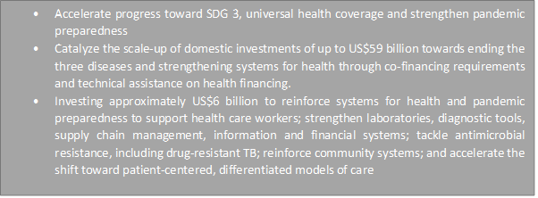 The Global Fund’s target for the Seventh Replenishment aims at raising at least US$18 billion to fight HIV, TB and Malaria and, build stronger systems for health. It is estimated that one-third of the US$18 billion translating to US$6 billion will be investments both in health systems that support the ongoing fight against HIV, TB and Malaria, and reinforce pandemic preparedness.